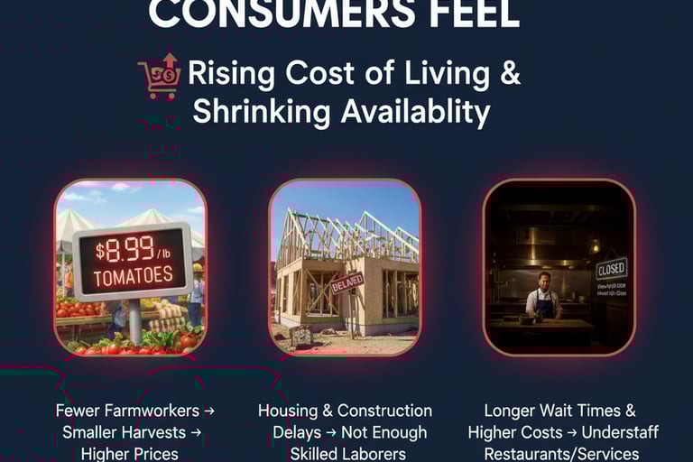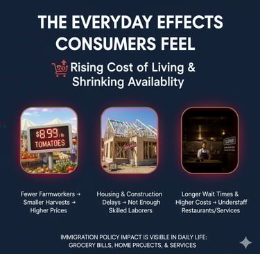 While immigration policies may sound like a distant political issue, their impact is visible in daily life. Grocery bills are climbing because fewer farmworkers means smaller harvests. Housing and construction projects are delayed because there aren’t enough skilled laborers. Even restaurants and services face longer hours and higher operating costs.